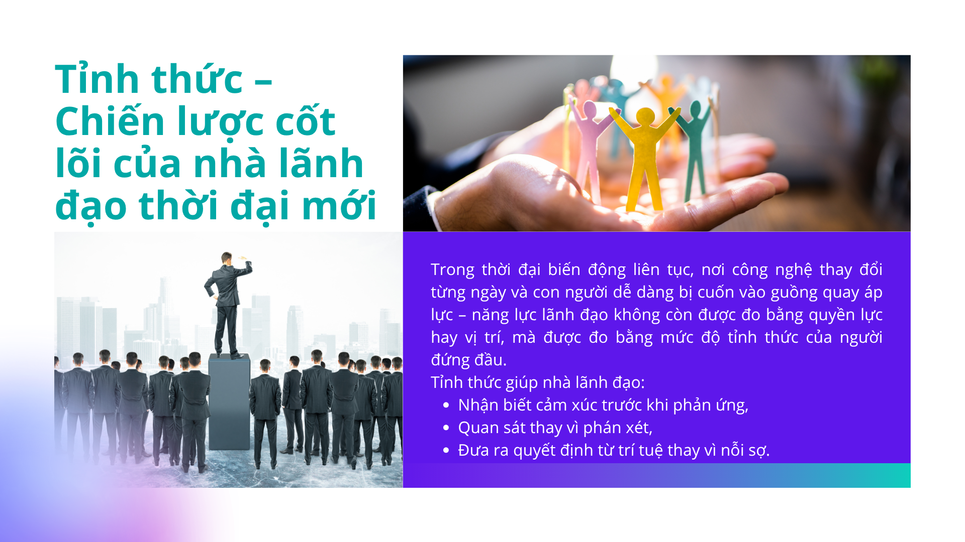 Nhờ vào sự tỉnh thức, nhà lãnh đạo không chỉ có thể đưa ra quyết định hợp lý mà còn tạo ra một môi trường mà mọi người đều cảm thấy được lắng nghe và tôn trọng.